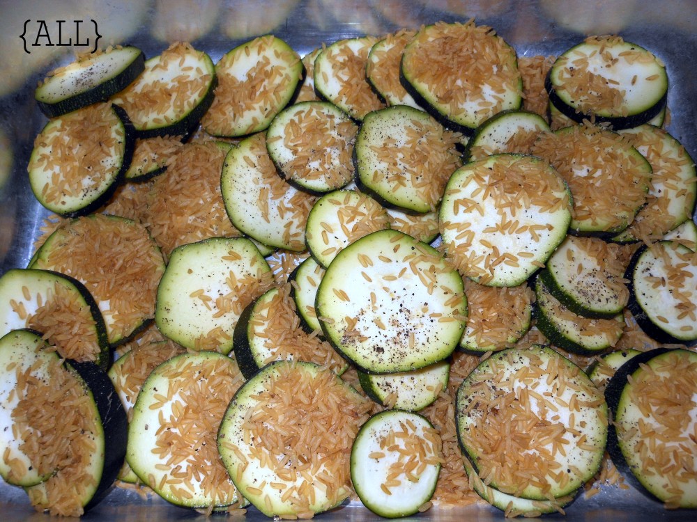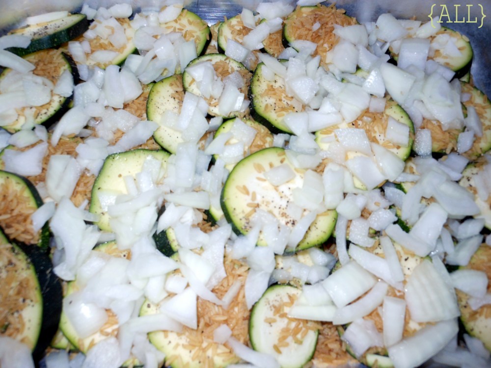 Next, add 1/3 cup of uncooked rice. (Not minute, just regular white, not brown. You’ll notice from the photo that I used brown. Big mistake – they cook differently!) The water from the zucs cook the rice.